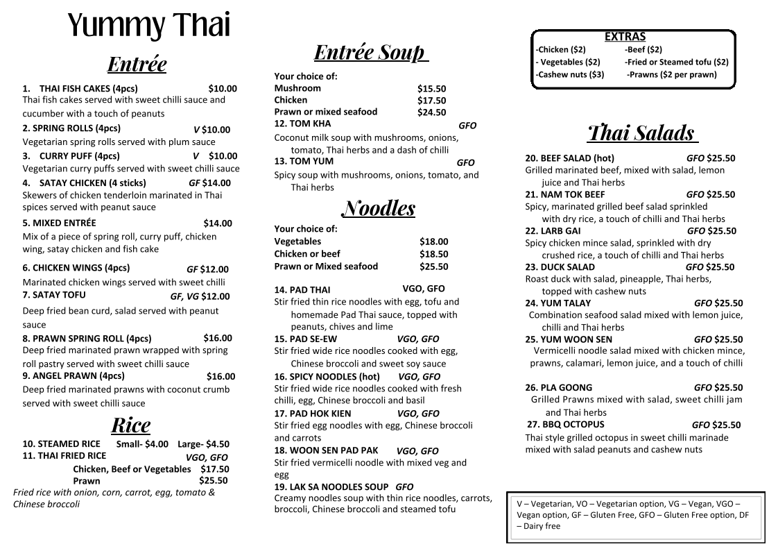 Yummy Thai at Morisset offers a diverse and vibrant menu, perfect for anyone craving authentic Thai flavors. For entrée options, guests can enjoy Thai Fish Cakes, Spring Rolls, Curry Puffs, Satay Chicken, or the Mixed Entrée. The restaurant also provides a selection of comforting soups, including the fragrant Tom Kha and the spicy Tom Yum. For salad lovers, the menu features flavorful dishes like the Beef Salad, Nam Tok Beef, Larb Gai, Duck Salad, and the refreshing Yum Talay. Those in the mood for noodles will be pleased with choices such as the classic Pad Thai, Pad Se-Ew, and the more adventurous Spicy Noodles, along with Pad Hok Kien and Woon Sen Pad Pak. For a satisfying side, the restaurant offers Steamed Rice and Thai Fried Rice, which pair perfectly with any main dish. With a variety of options to choose from, Yummy Thai at Morisset ensures that every guest leaves satisfied.